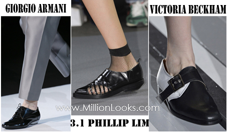 Los zapatos estilo masculino triunfan en Victoria Beckham quien los ha diseñado en blanco y negro, Phillip Lim los ofrece con correa Y plana de estilo masculino y Giorgio Armani se decanta por el típico estilo clásico para caballero pero ahora también para mujer.
