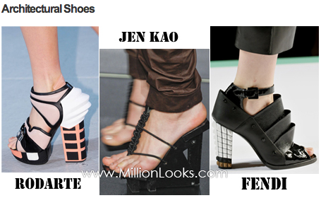Los zapatos arquitectónicos como se ha visto en Fendi, Rodarte, y Jen Kao sorprenderá con la cantidad de detalles y soluciones de estilo. Piezas más simples, pero no menos elegantes se pudieron ver en Missoni, Guy Laroche, y J. Mendel.