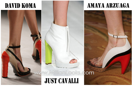 Shoes with eye catchy heels are ‘in’ for the season. Just Cavalli, David Koma and Amaya Arzuaga chose to add color to their unusually shaped heels while Matthew Williamson and Calvin Klein Collection focused more on shapes and textures. Helmut Lang, Givenchy, and Gianfranco Ferre created amazing unconventional heels that definitely draw attention.