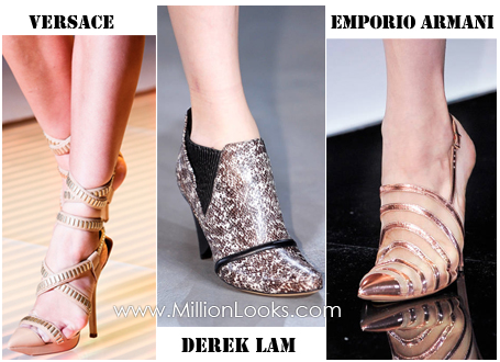 Zapatos metálicos es una de las mayores tendencias para la temporada primavera / verano 2013. Zapatos y sandalias lámina de plata estaban sobre la pista durante la Semana de la Moda vio a Nicole Miller, Emporio Armani, shows de moda Giambattista Valli. En Moschino sandalias de tacón estaban decoradas con cristales triturados y placas metálicas de hoja, mientras que en Viktor & Rolf bombas metálicas estaban hechas de material texturado.