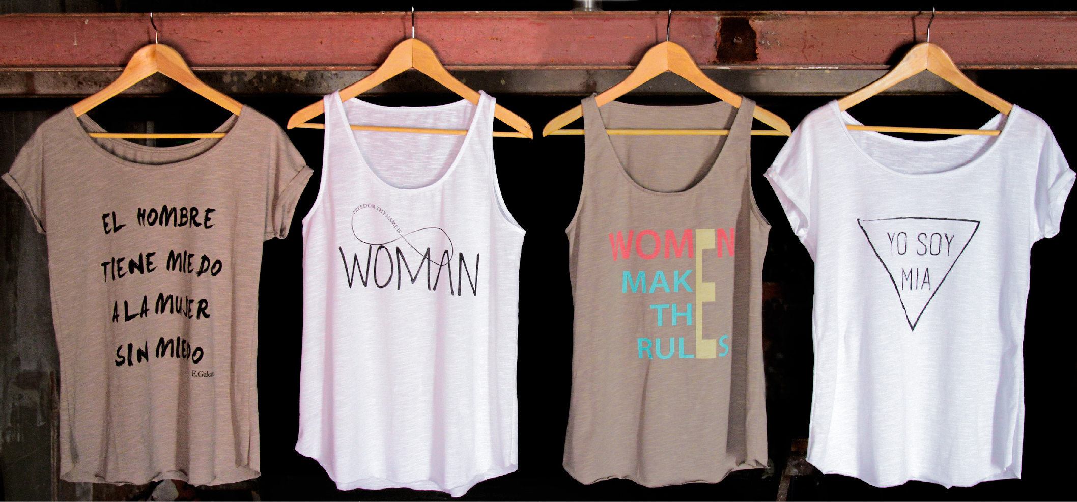 Por ahora tenemos a la venta nuestra primera colección de camisetas que consta de cuatro modelos. Hemos creado camisetas atractivas con mensajes con contenido real aunando ética y estética. Cada modelo tiene un mensaje alentador y reivindicativo.