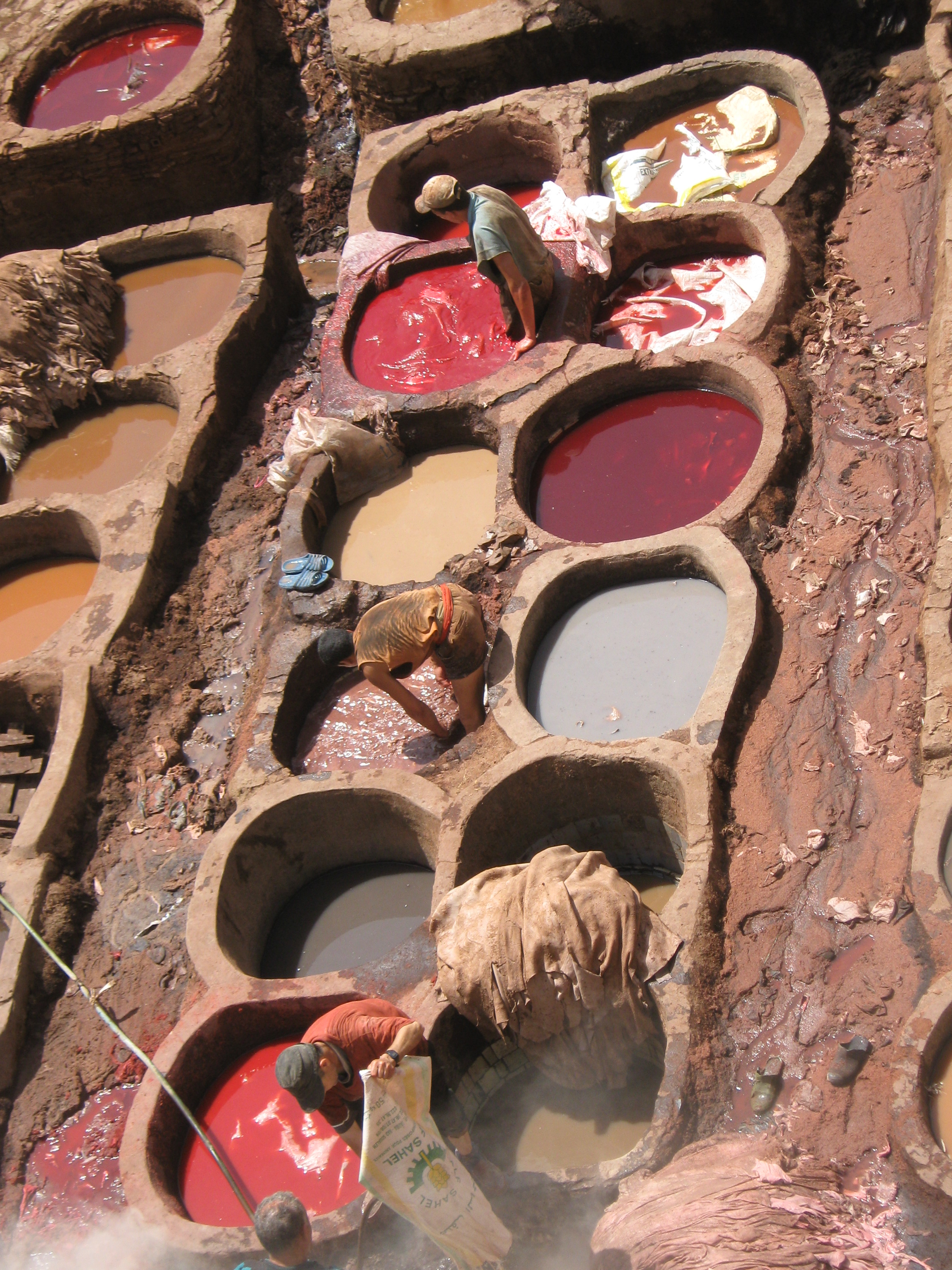 Tercera fase: en esta fase se aplican los tintes repetidamente durante varios días, colores 100% naturales a base de flores, plantas, semillas, especies y piedras mezcladas con aceites. Los colores más utilizados son el rojo (que se extrae de la amapola), naranja (extracto de henna), amarillo (que viene del azafrán, también considerado color Royale y especialmente utilizado para las babuchas que todos los fecíes combinan con sus mejores galas los viernes: día del rezo más importante de la semana); negro (piedra mineral también muy habitual para usar como maquillaje o máscara de ojos), azul (piedra índigo), verde (extracto de menta) y marrones y ocres (a base de huesos de dátil o cáscara de la granada). Evidentemente, las pieles color rosa, lila, turquesa… etc. que se pueden encontrar, se obtienen haciendo combinaciones de los primeros seis colores. También en esta fase, y sobretodo las pieles destinadas para hacer lámparas, tambores e instrumentos musicales, pasan unas horas en una tinaja de guano (excrementos de paloma), para conseguir elasticidad, dar a la piel una textura más fina y sorprendentemente, eliminar el olor.